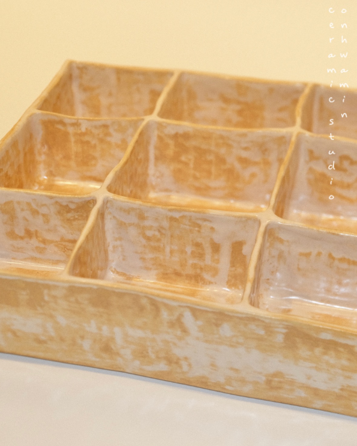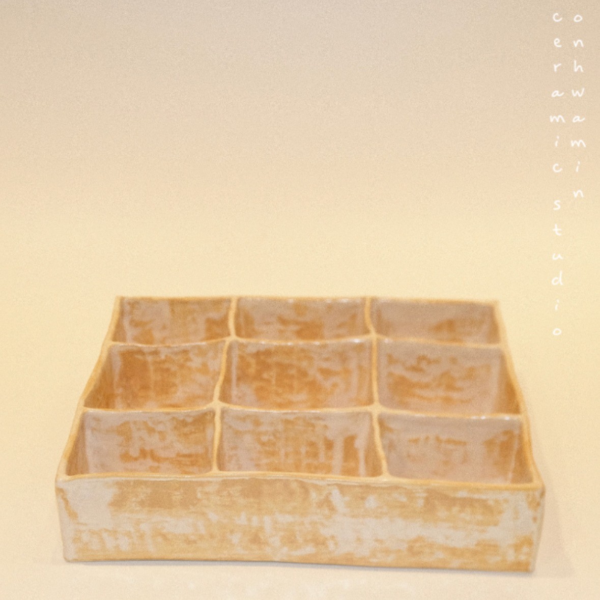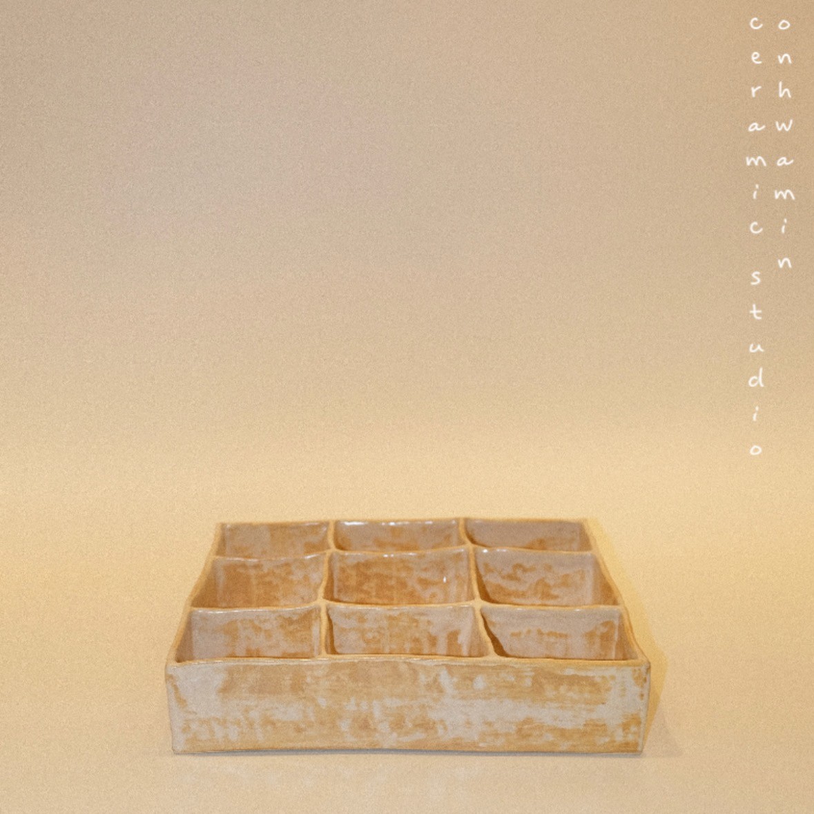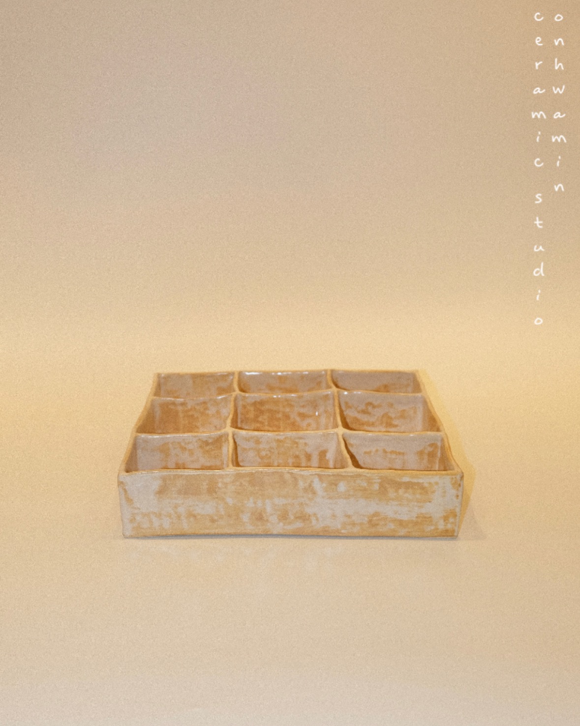 핸드빌딩의 독특한 손자국과 빈티지한 유약이 특징인 9칸 나눔트레이 ˚‧˚❧