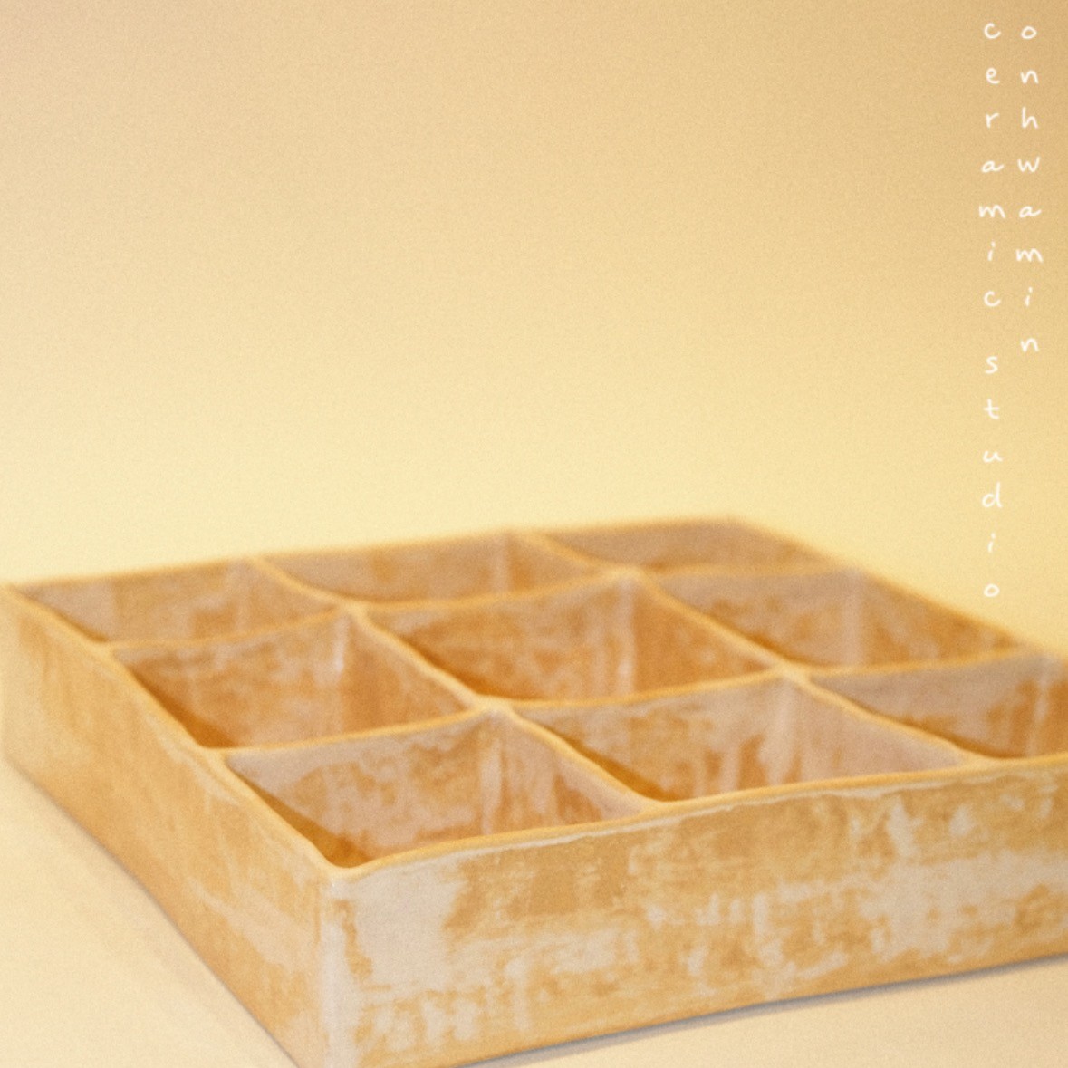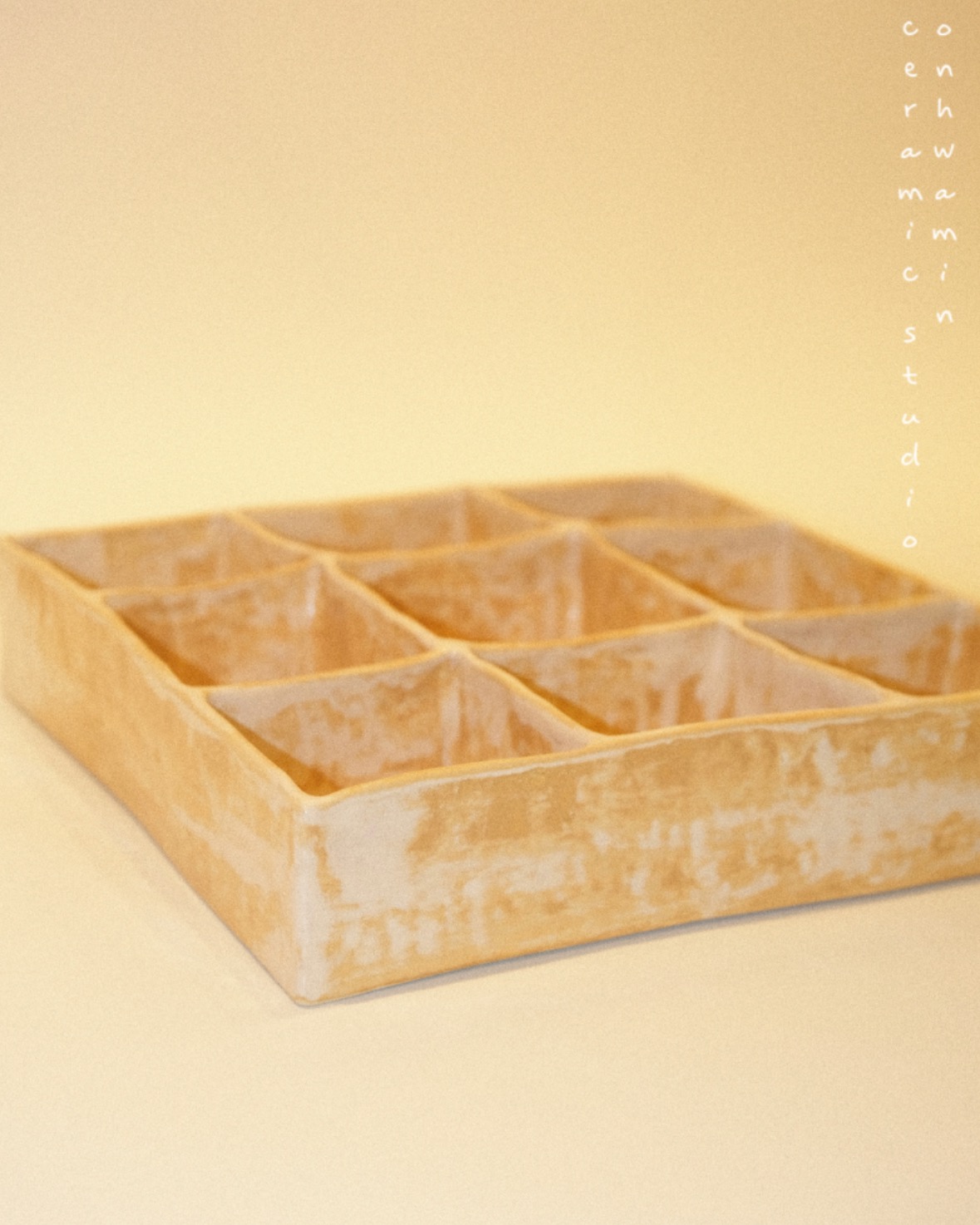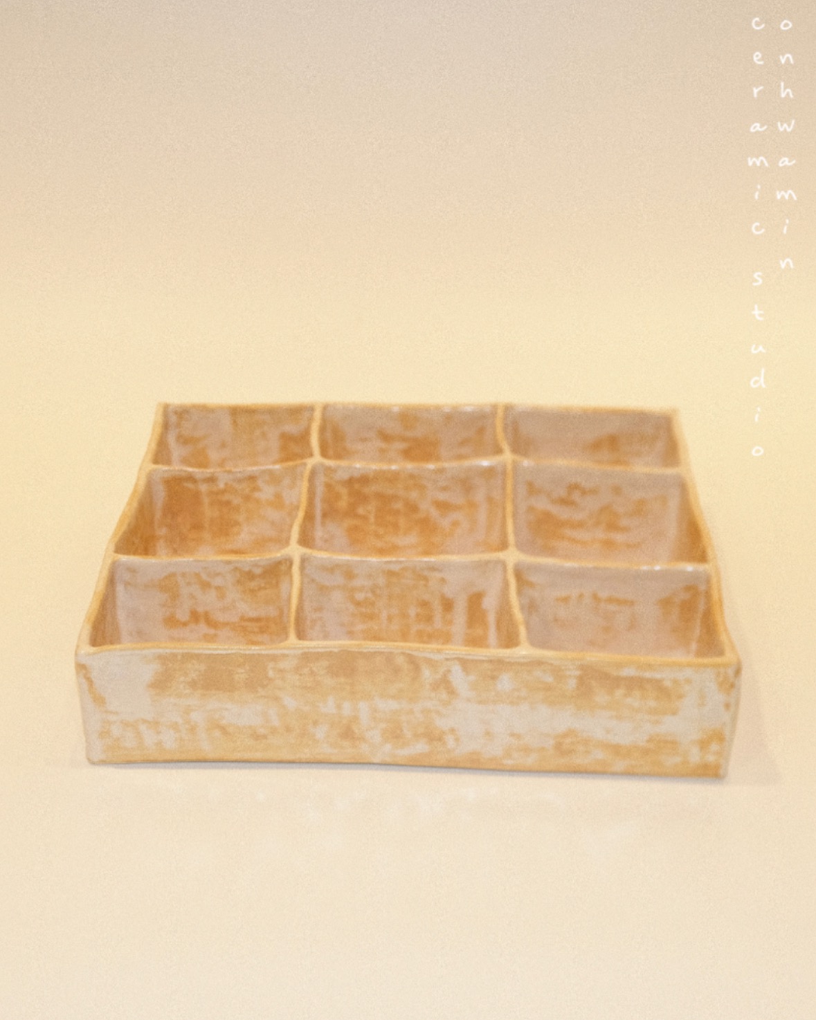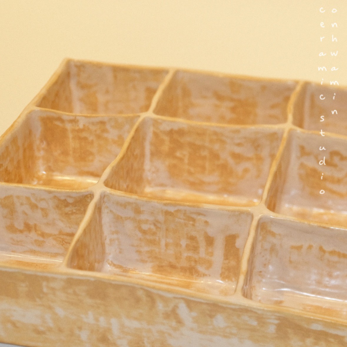 핸드빌딩의 독특한 손자국과 빈티지한 유약이 특징인 9칸 나눔트레이 ˚‧˚❧