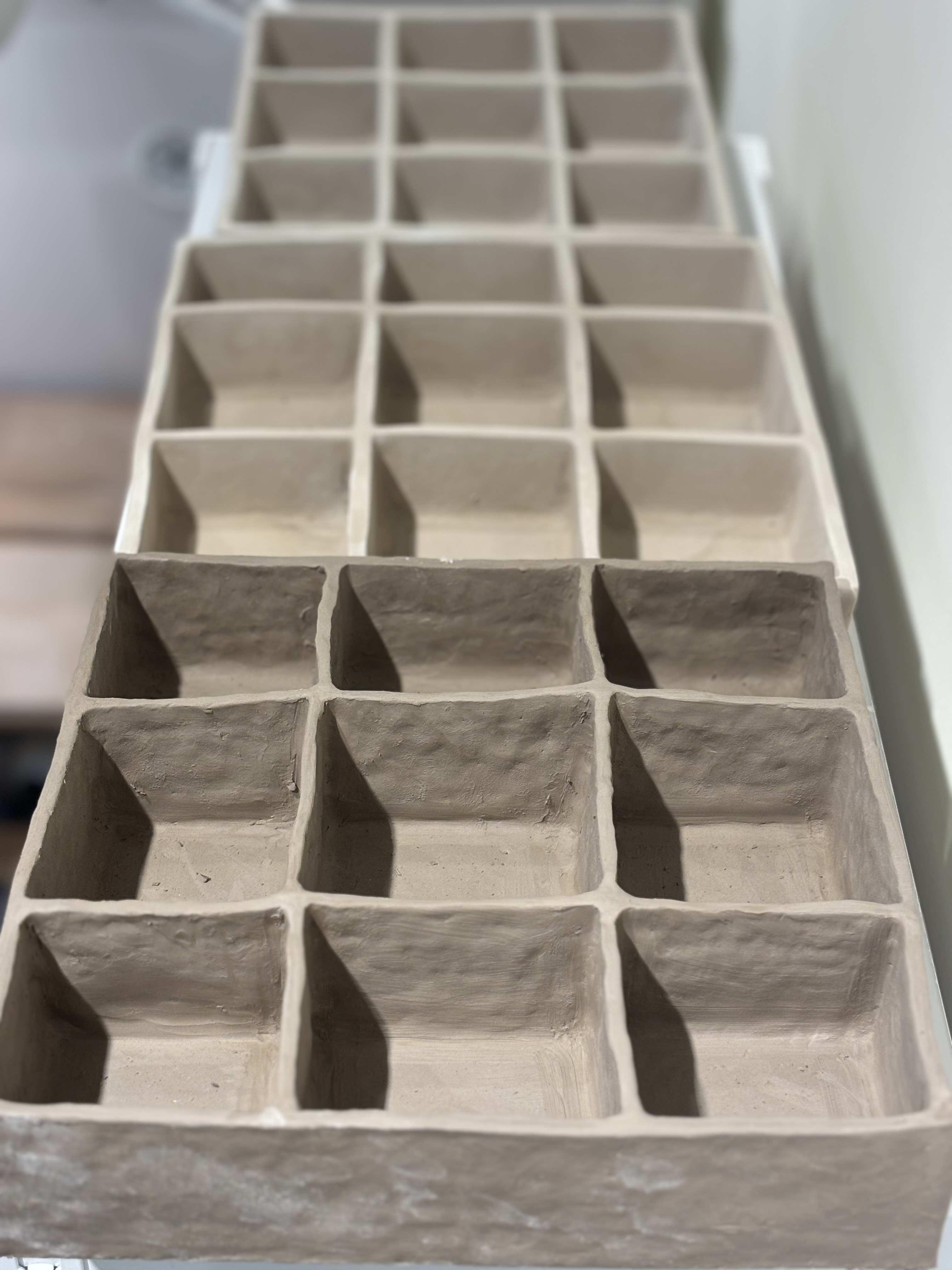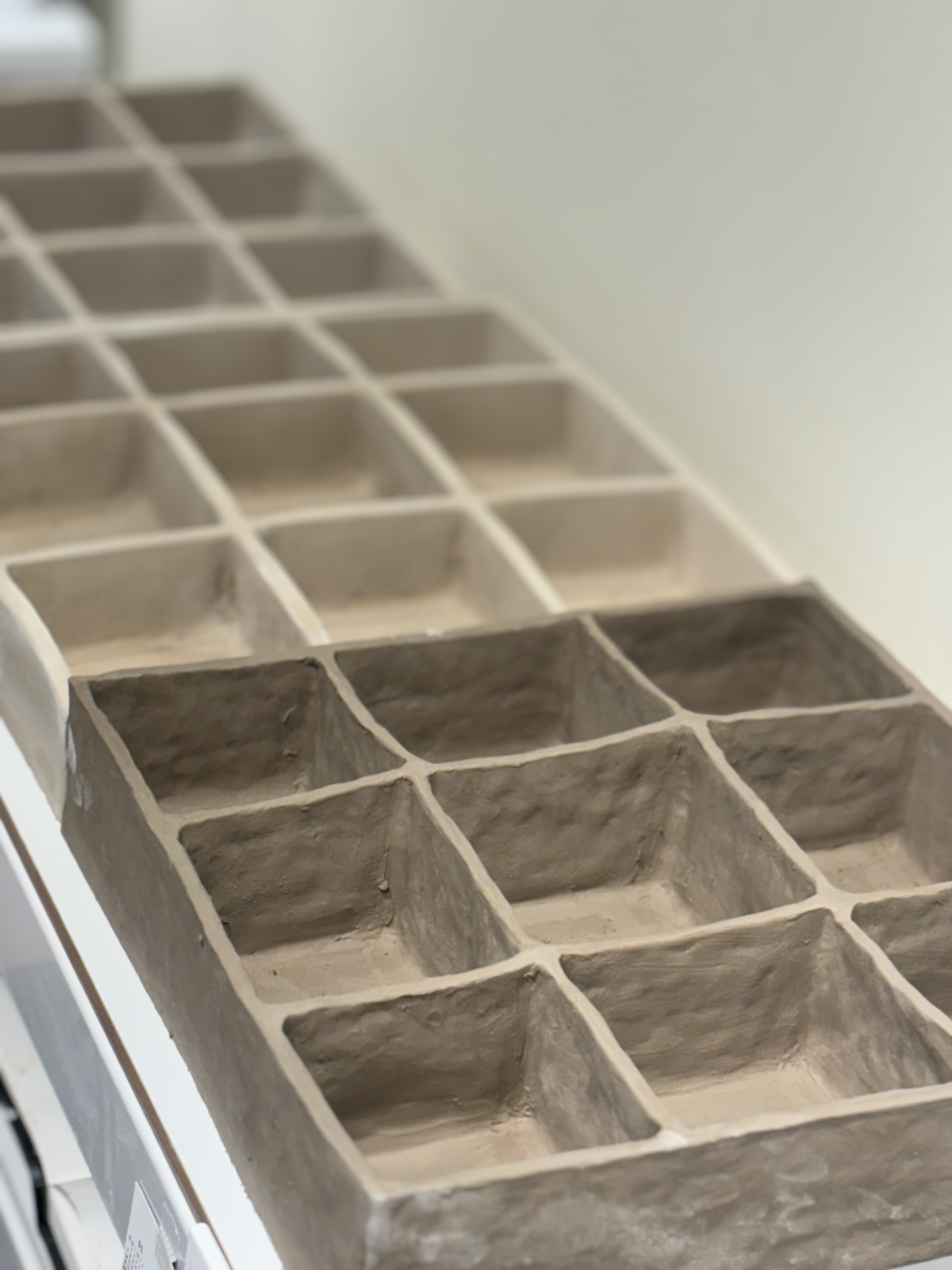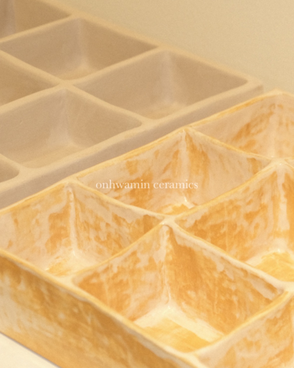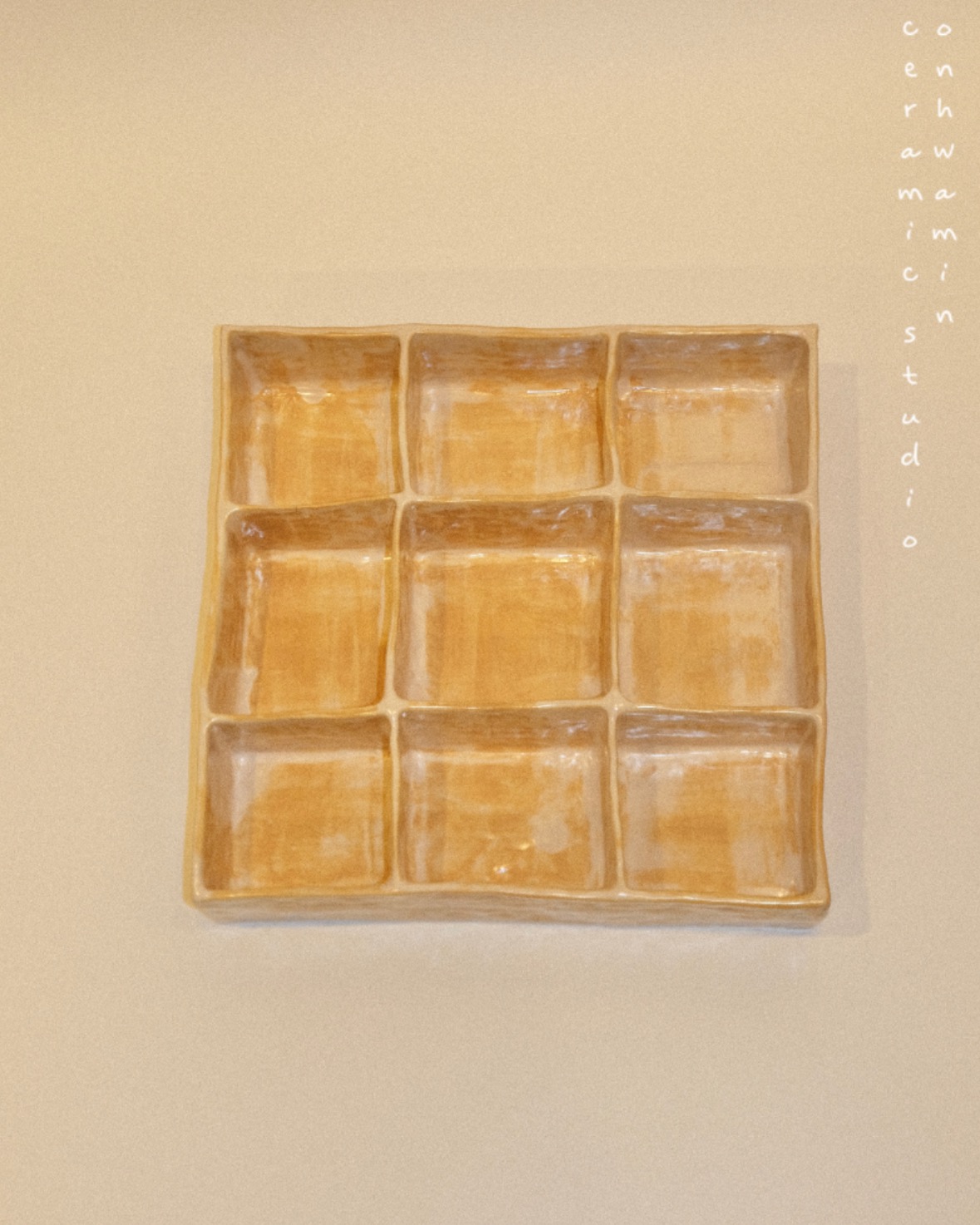 핸드빌딩의 독특한 손자국과 빈티지한 유약이 특징인 9칸 나눔트레이 ˚‧˚❧